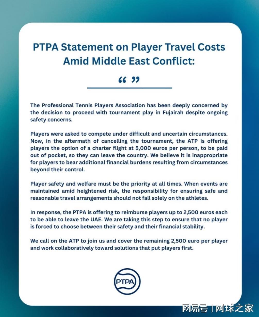 特别是PTPA(职业网球球员协会)第一时间介入这件事,对外郑重表态会承担每人的一半费用,剩余费用由ATP负责后,更让ATP承担了非常大的压力。