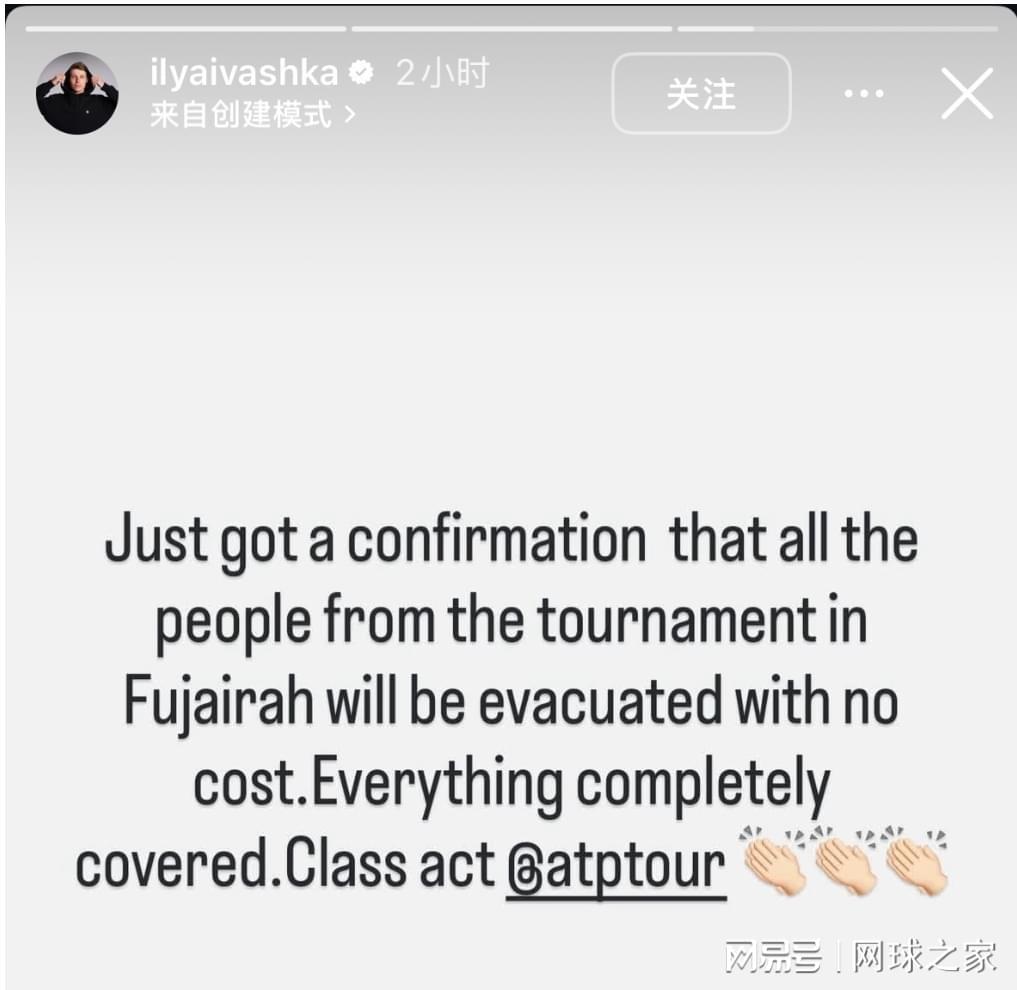 就在所有人都在期待ATP的表态,以及这件事的最终走向时,球员伊利亚·伊瓦什卡通过个人社交媒体第一时间对外透露,所有球员的抗争和外界为滞留球员的发声赢得了全面胜利,撤离中东包机费用事件画上了句号,结果让所有人都很满意。